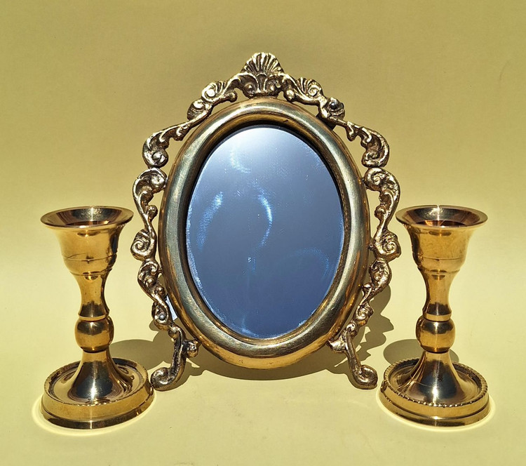 اندازه محصول: ابعاد آینه:۱۳×۱۶سانت/ارتفاع شمعدان:۸ سانت/اندازه ظرف صدفی:۸×۹سانت ارتفاع۳.۵سانت